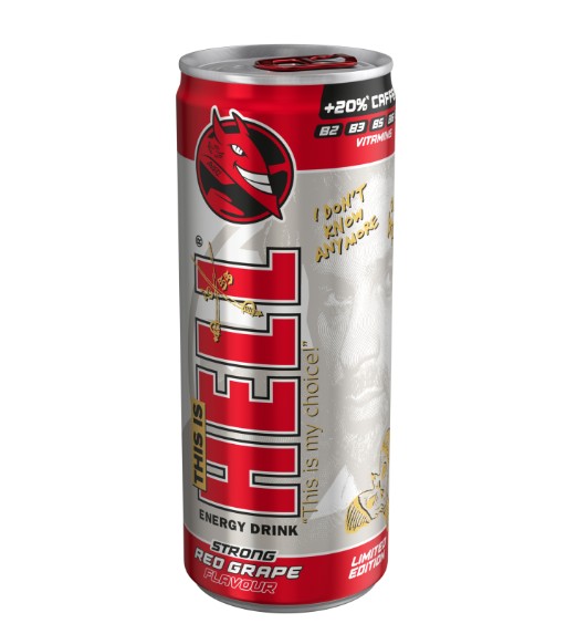 A Hell Red Grape Strong energiaital a megszokott 32 mg/100 ml helyett +20% koffeintartalommal rendelkezik. B2-, B3-, B5-, B6-, B12-vitaminokban gazdag, tartósítószert nem tartalmaz. Környezettudatos csomagolásban kapható.