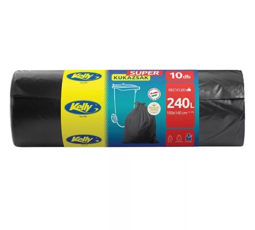 A Kelly Super kukazsák a tökéletes megoldás a nagyobb mennyiségű hulladék kezelésére. Extra erős kialakításának köszönhetően megbízhatóan tartja a nehéz és terjedelmes hulladékot is. A 240 literes űrtartalom és a 100×140 cm-es méret ideálissá teszi a háztartási, kerti vagy ipari felhasználásra. A tekercs 10 darab kukazsákot tartalmaz, így hosszú ideig biztosítja a hulladék tárolását.