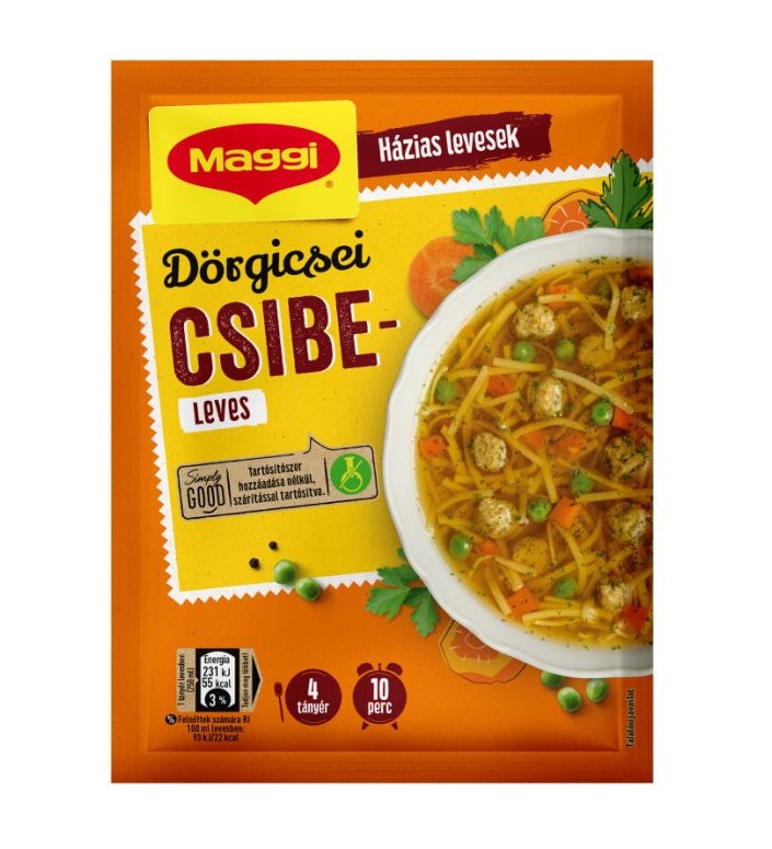 - Ezen levesben a fiatal csibe minden zamata egybeforr a különféle zöldségekkel. A sárgarépa és a zöldborsó látványa kellemes színpompába öltözteti a Maggi Dörgicsei csibelevest.