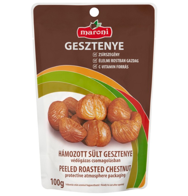 Maroni hámozott sült egész gesztenye alumínium tasakban. A Maroni biztosítja, hogy a gesztenyekedvelők egész évben kedvükre fogyaszthassák ezt a prémium minőségű gyümölcsöt.