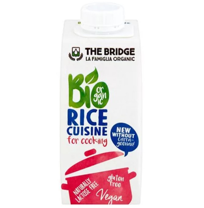 A The Bridge BIO Rizskrém főzéshez remek növényi alternatíva az állati tejszín helyett. Használja bármely fogás elkészítéséhez, sütéshez vagy főzéshez, sűrítse, tegye krémessé ételeit ezzel az egészséges laktóz- és tejfehérjementes termékkel. A BIO Rizskrém „”tejszín””, az ideális termék, hogy ízletes ételeket készítsünk egészségesebben, könnyedebben és kevesebb állati zsiradékkal.