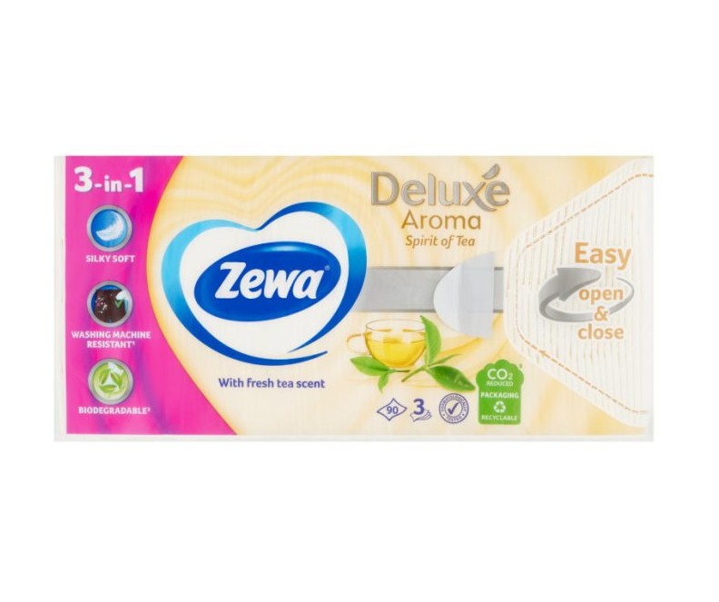 A 3 rétegű Zewa Deluxe Spirit of Tea papírzsebkendő enyhe illatával, és szakadásmentes puhaságával gyengéd, megbízható gondoskodást garantál minden élethelyzetben.A könnyen nyitható és visszazárható csomagolás még kényelmesebbé teszi a használatát!A Zewa 3 az 1-ben papírzsebkendőkkel egyszerre törődhetsz magaddal, szeretteiddel és a környezettel is. Új, továbbfejlesztett változata most puhább, mint valaha, és még mindig elég erős ahhoz, hogy mosáskor is egyben maradjon, így nem kell aggódnod, ha azt veszed észre, hogy a ruhák közé került egy a mosógépben. A pihepuha anyag biológiailag lebomlik, így tökéletes arra, hogy mindenféle maszatot letörölj, és közben a környezetnek se árts.Ellenáll a mosásnak – Független intézet vizsgálatával igazolt eredmény: ruhazsebben, maximum 60 fokon, 3 kg mosógéptöltet mellett végzett mosásra vonatkozóan.